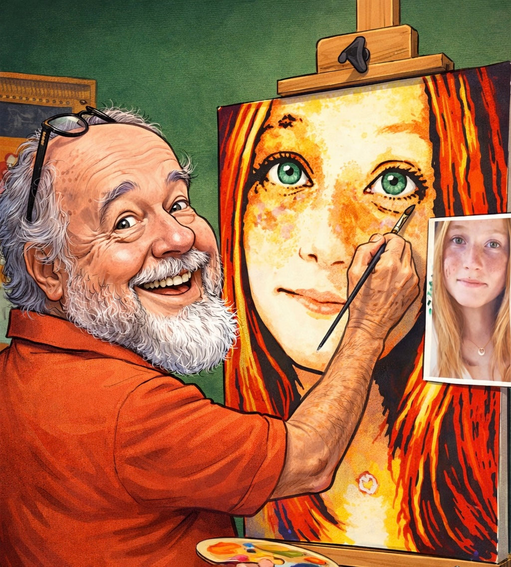 Description: Cover Girl is a piece that invites you into an intimate moment of creation both the subject and the artist captured in the same frame. The painting features a young woman with striking green eyes and flowing red hair. Her complexion is warm and soft, with freckles scattered naturally across her cheeks and nose, adding a touch of authenticity that grounds the portrait. What makes the image especially compelling is the attention to detail: my brush is poised near her left eye, working meticulously to bring out the subtle textures and tones. A photograph of her is a reference that underscores the connection between reality and representation. The bright colors and sharp contrasts give the portrait a vivid presence, making it feel less like a still image and more like a living encounter.