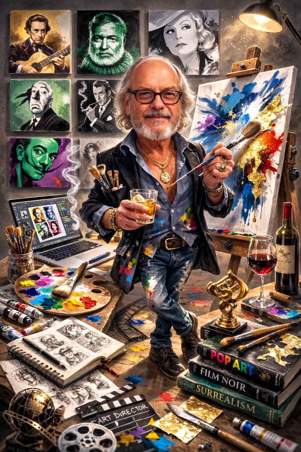 Description: This vibrant illustration captures an intimate moment within an artist’s workspace, inviting viewers into a world where creativity and contemplation intersect. At its center stands a man, embodying both experience and passion, holding a paintbrush in one hand and a glass of whiskey in the other. He is surrounded by an array of artistic tools a painter’s palette rich with bold colors, an easel showcasing an abstract expressionist piece alive with splashes of blue, gold, and red, alongside stacked books referencing movements like Pop Art, Film Noir, and Surrealism. The carefully rendered details extend to the artist’s attire, glasses, a dark jacket, and paint spattered jeans each element contributing to the genuine atmosphere of a creative life well lived.